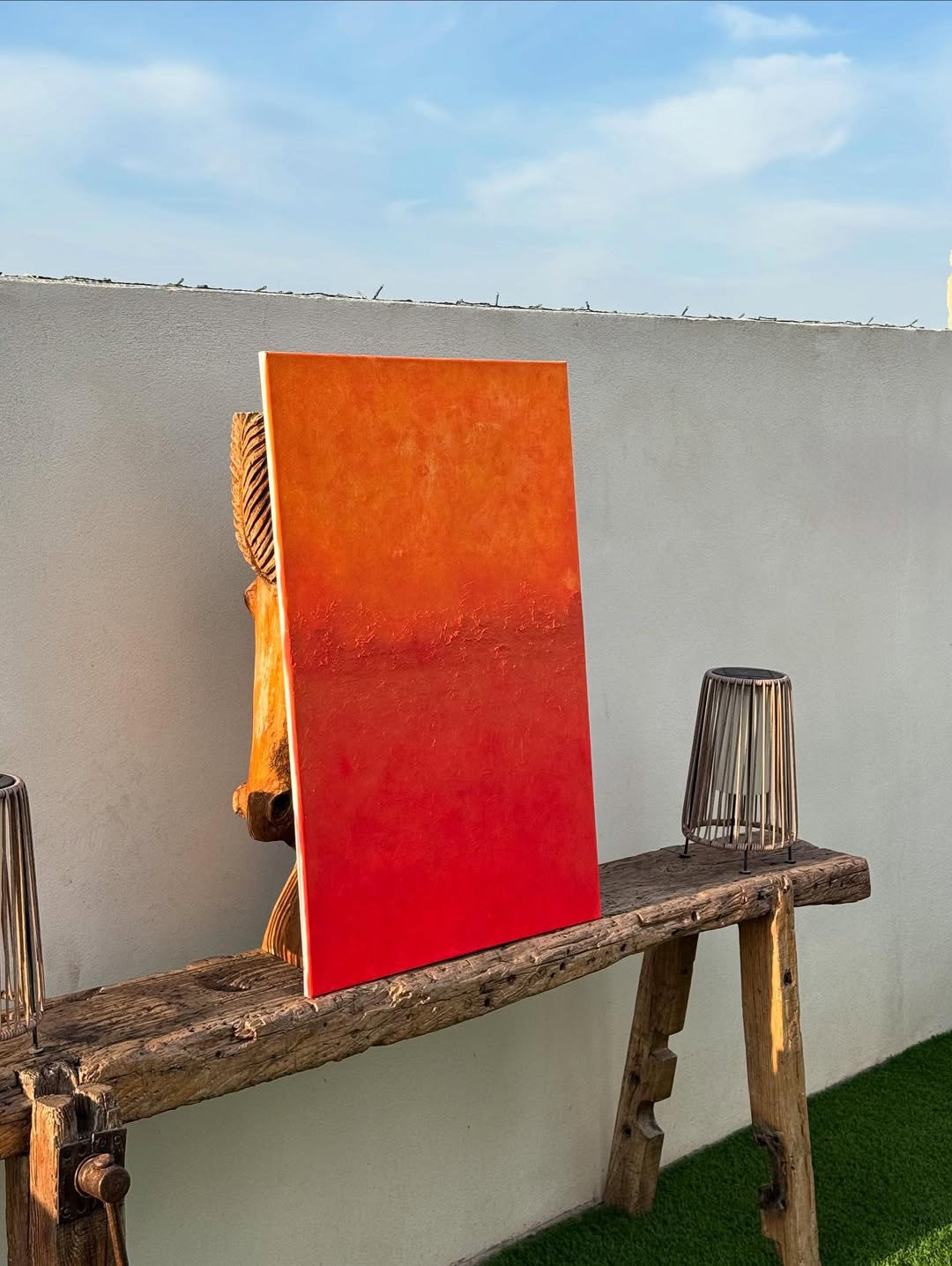Desde el color rojo encendido pasando por los anaranjados hasta diluirse en el ámbar de lo intangible. No existe horizonte, es una vibración, una herida de luz. La textura, densa, intuitiva, indomable, brota desde lo más visceral. Cada trazo encierra una pulsación, como si el corazón del día se estuviera apagando con un último latido caliente. No hay contornos. No hay figuras. Solo una expansión de color que asciende y arde sin quemar, evocando esa hora en que todo parece posible y todo se despide al mismo tiempo. “Atardecer” es un cuerpo que siente. Una emoción sin nombre. Una despedida que abraza.