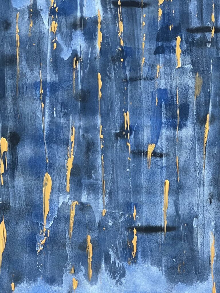 Este cuadro respira una intensidad ecléctica, donde el azul profundo, líquido, casi abismal, se despliega...
