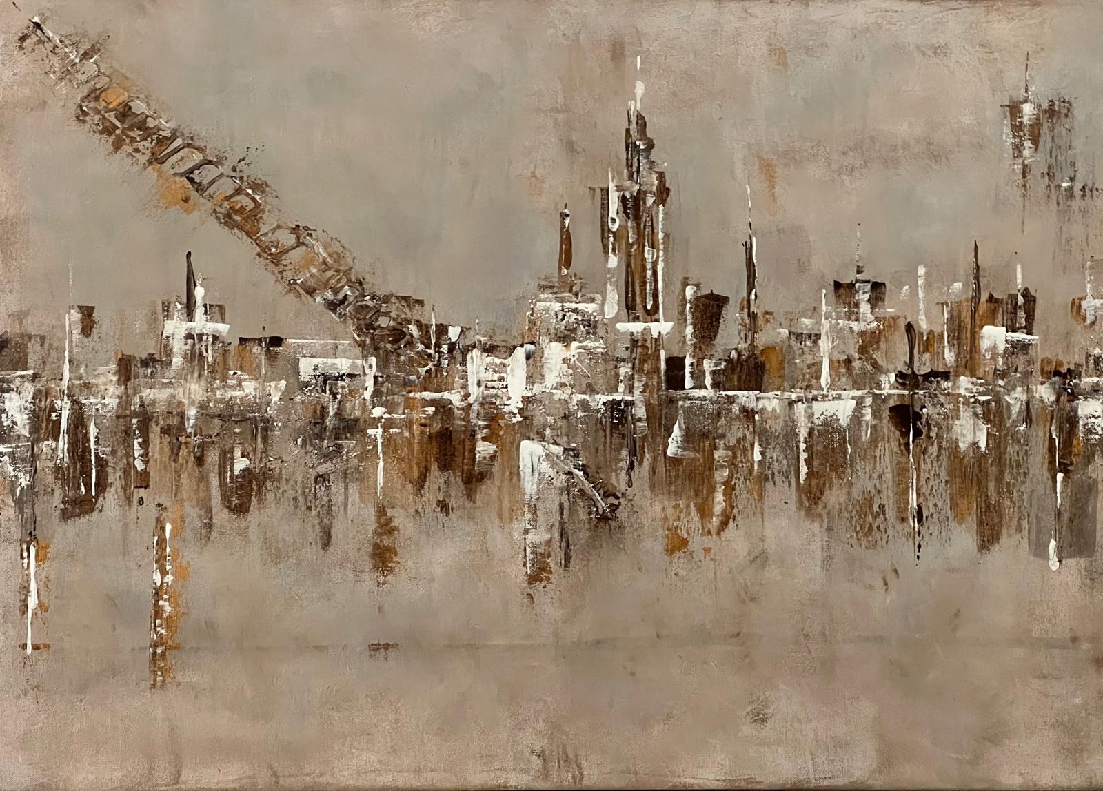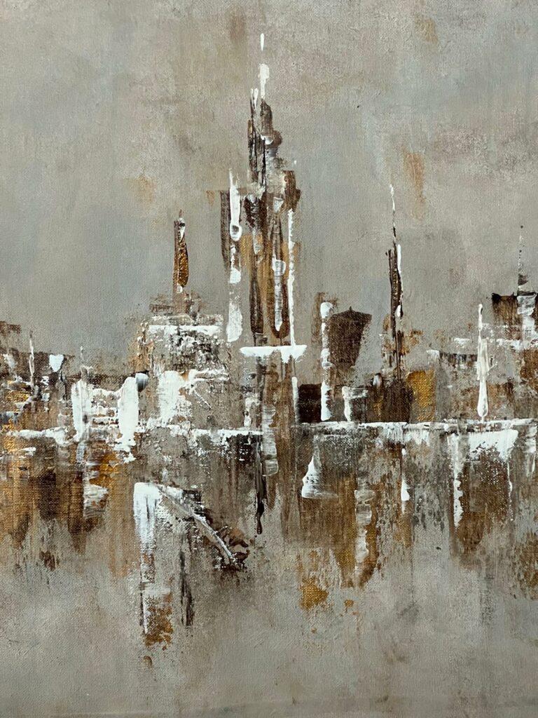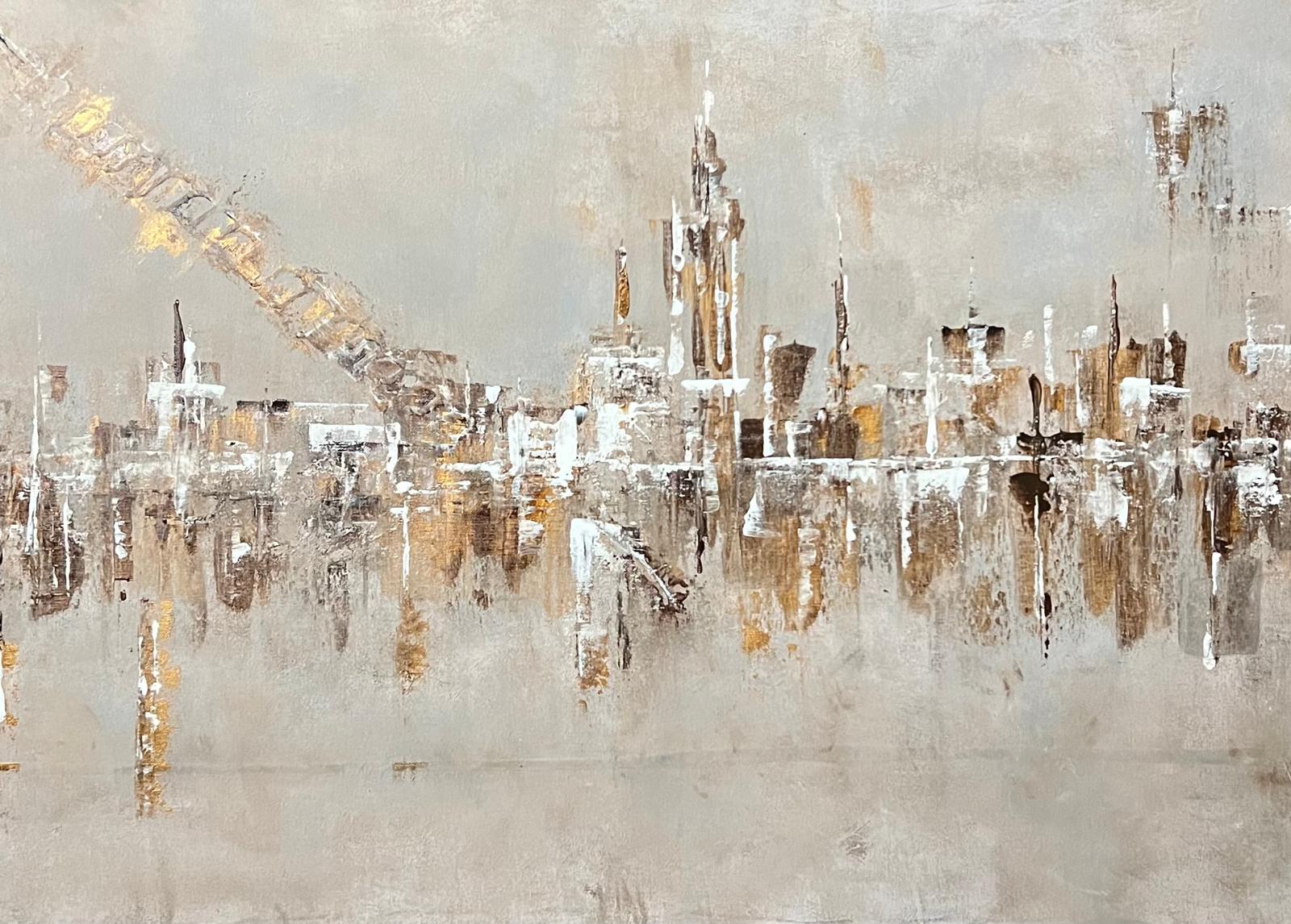 La composición se construye a partir de una gama de beiges suaves, ocres cálidos y blancos erosionados, salpicados por destellos dorados que capturan la luz. Estos tonos, trabajados en capas y relieves, generan una atmósfera etérea, casi polvorienta, donde la materia parece flotar más que asentarse. Las formas verticales, irregulares y fragmentadas, sugieren una ciudad lejana, desdibujada por el tiempo y el silencio.