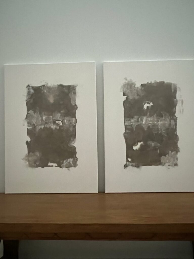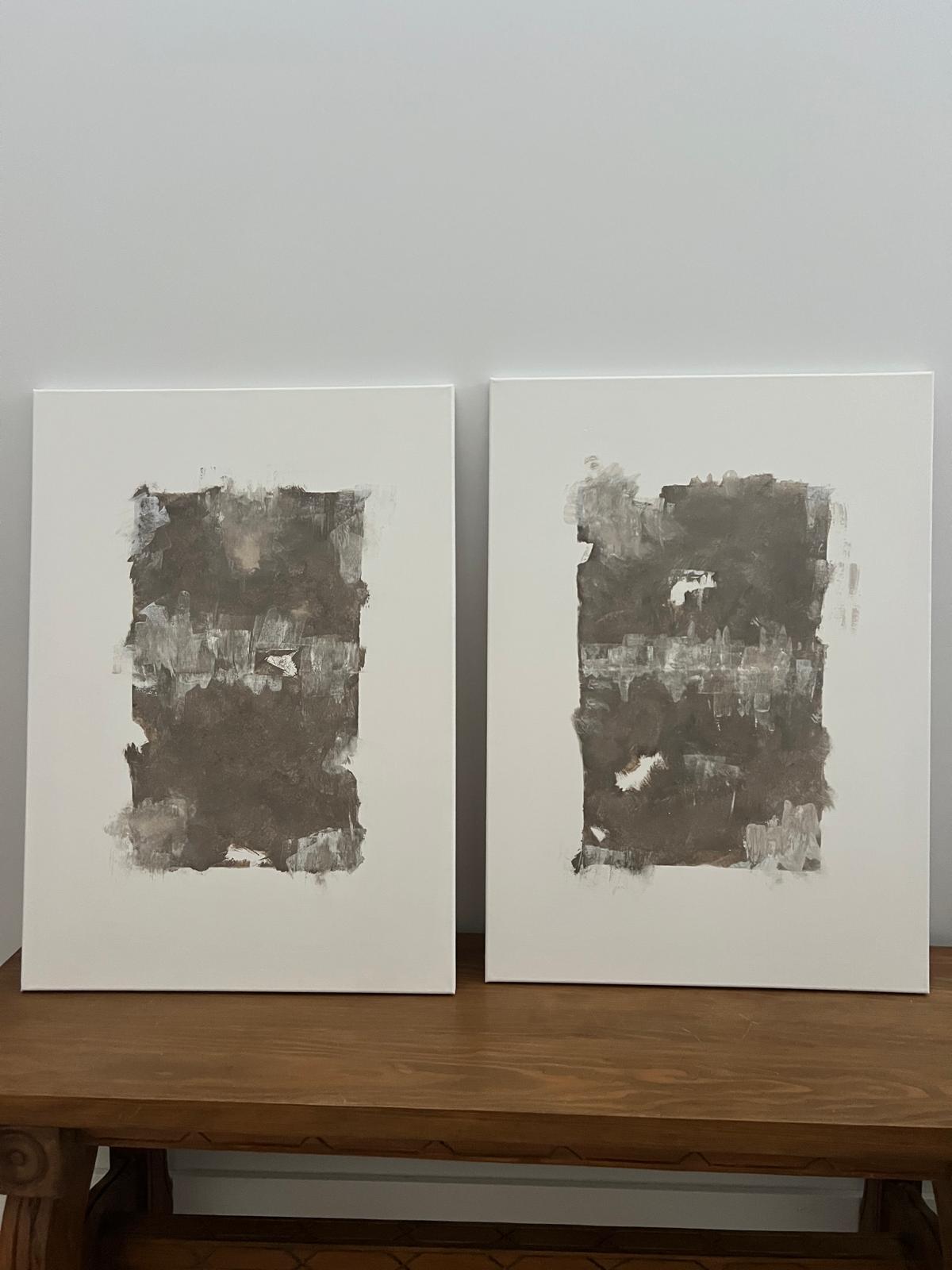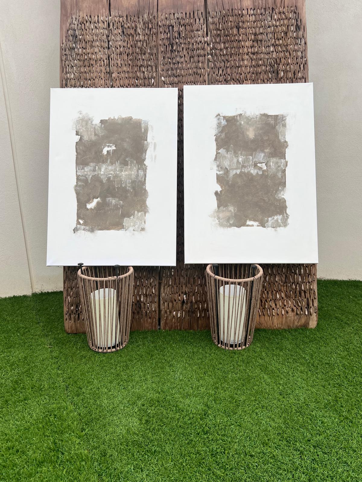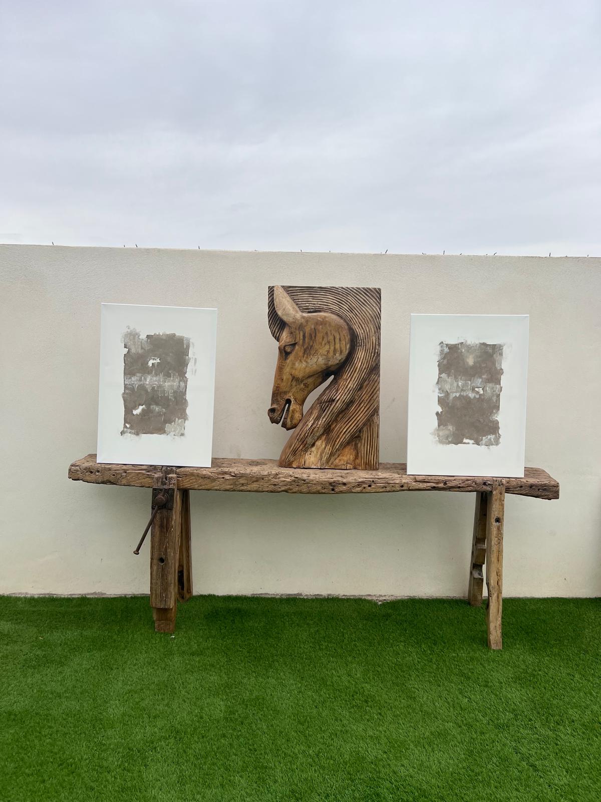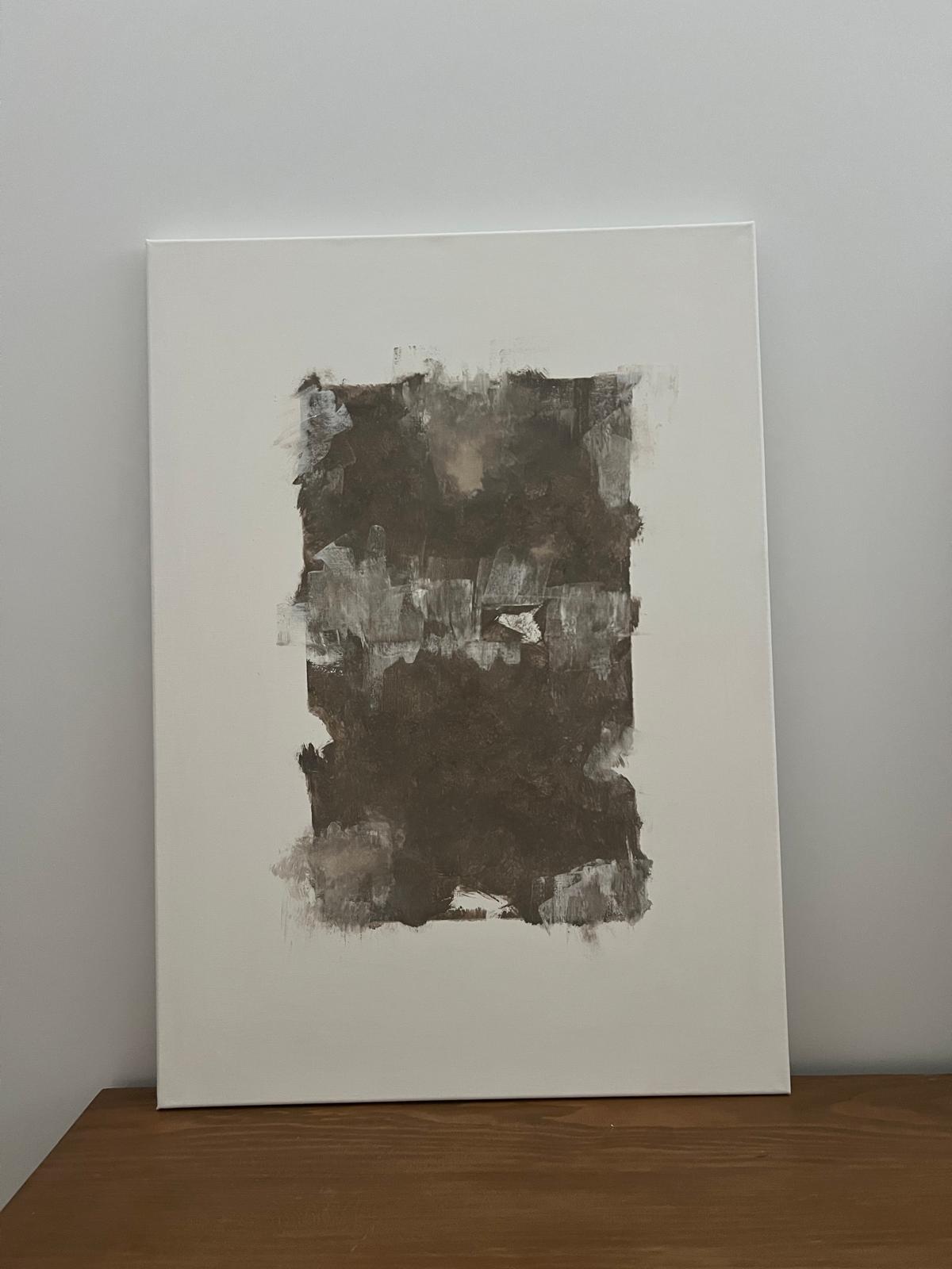 Sobre él, los trazos en marrón desgastado evocan la fragilidad de lo humano, fisuras, heridas, costras que narran historias invisibles.