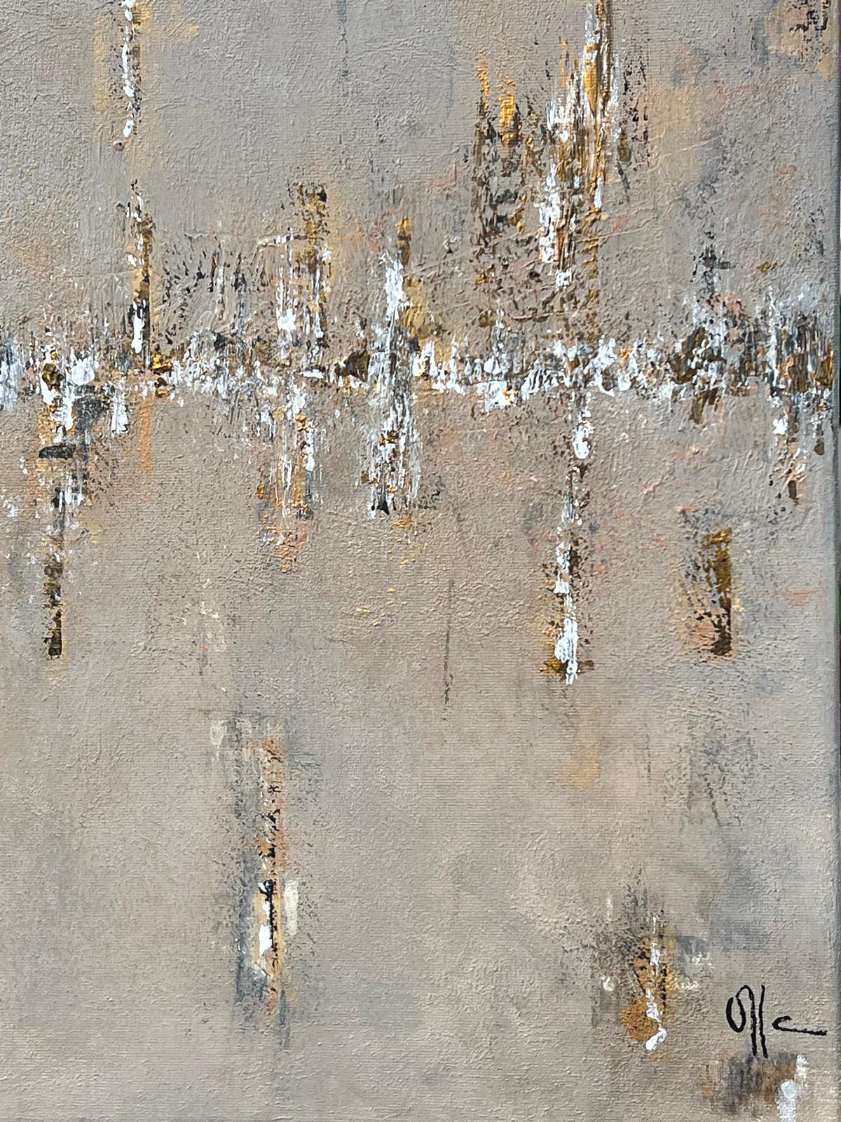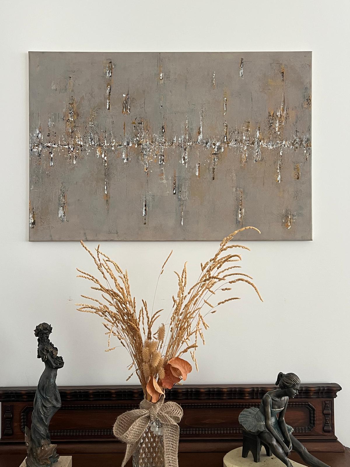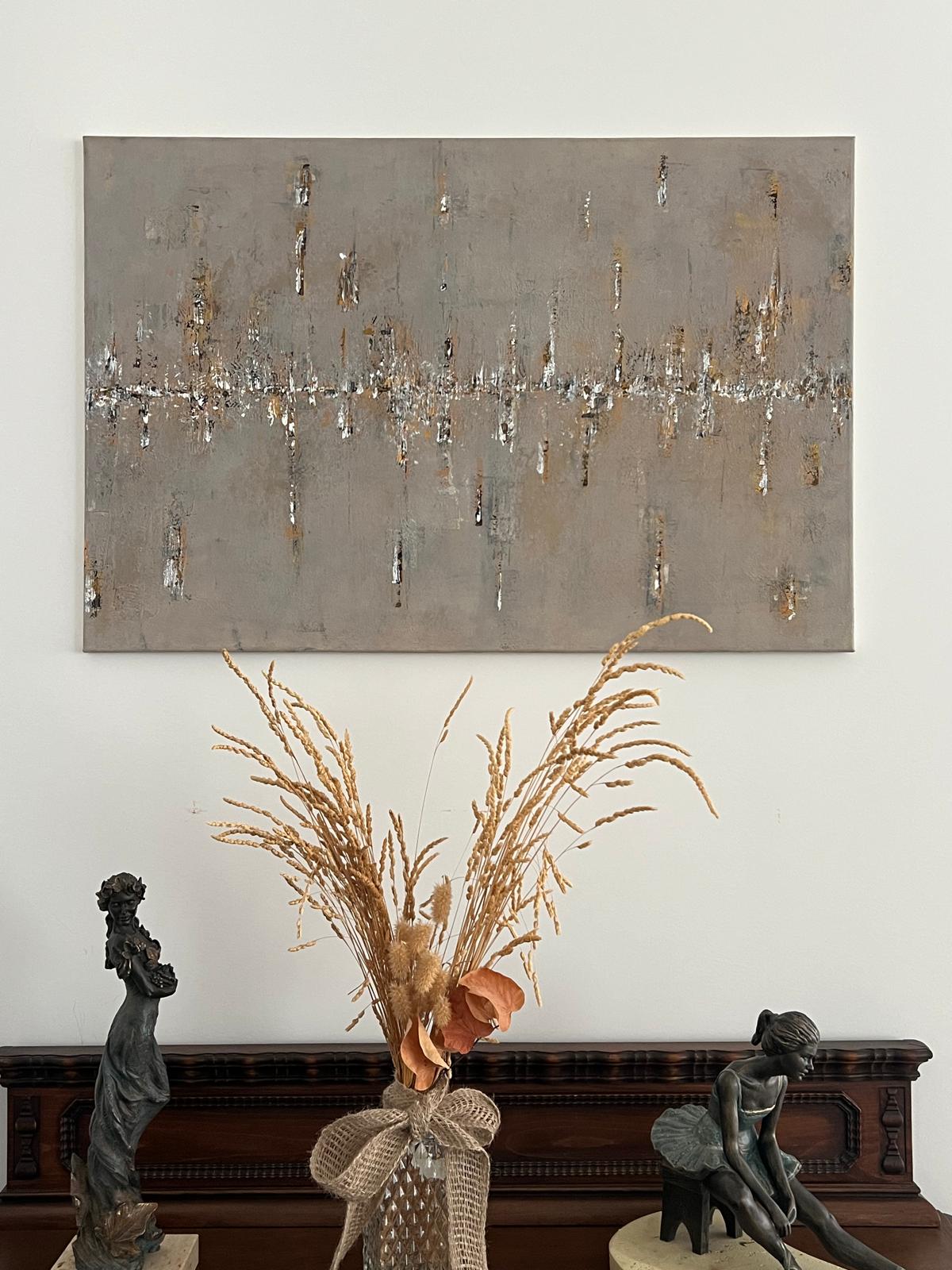 Invita a una contemplación pausada. No hay un punto único de anclaje, la mirada se desplaza, descubre variaciones, pequeños cambios que emergen según el ángulo y la intensidad lumínica. Lo atornasolado aparece como un fenómeno vivo, nunca idéntico, siempre en tránsito, vibra entre trazos negros, blancos y dorados, evocando la experiencia humana, decisiones del alma y del cuerpo, vacíos en el camino, espacios abiertos para la esperanza. Hay lágrimas de amor, segundos de rabia, palabras que no dicen nada y abrazos que curan. Todo convive en una quietud dinámica, viva, siempre cambiante según la mirada.