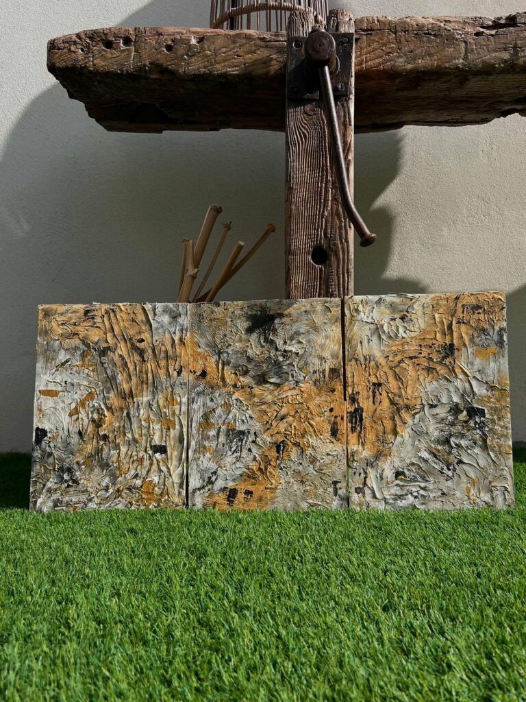 Metamorfosis es una obra conformada por una serie de cuadros: un tríptico y dos dípticos, creados sobre tablas viejas que estaban apartadas para ser desechadas. Aquello que parecía destinado al olvido adquiere aquí una segunda vida gracias al acrílico y la textura, convirtiéndose en arte.