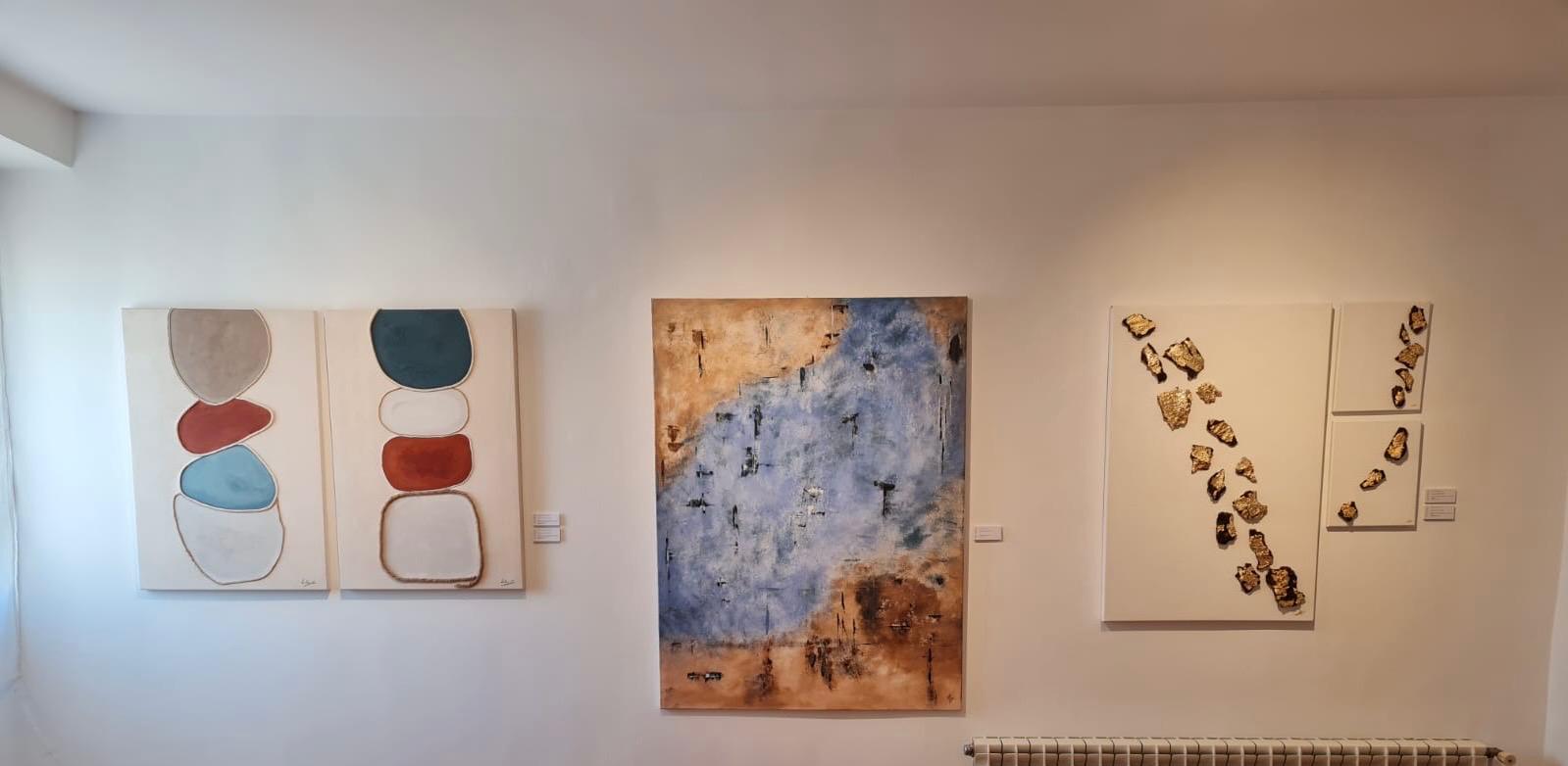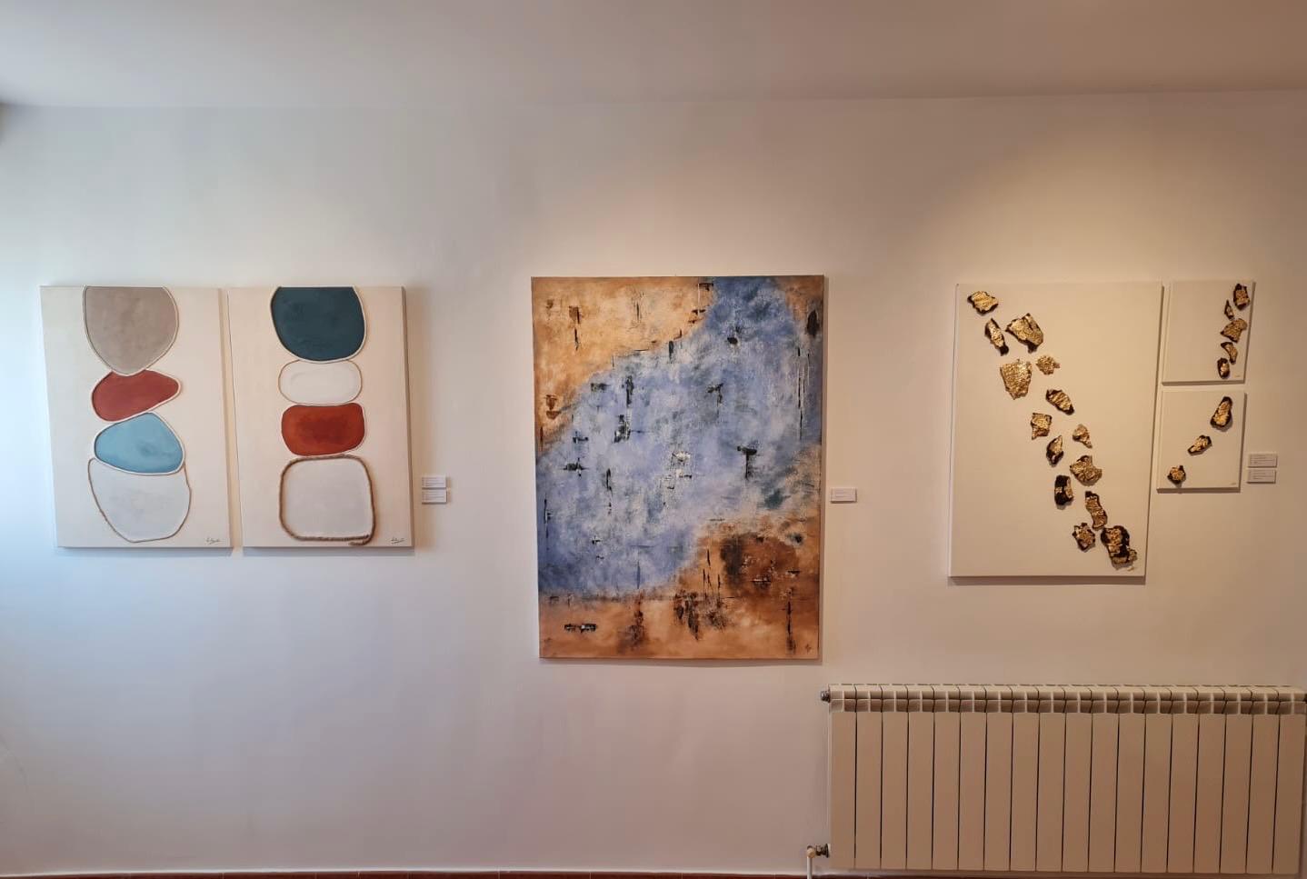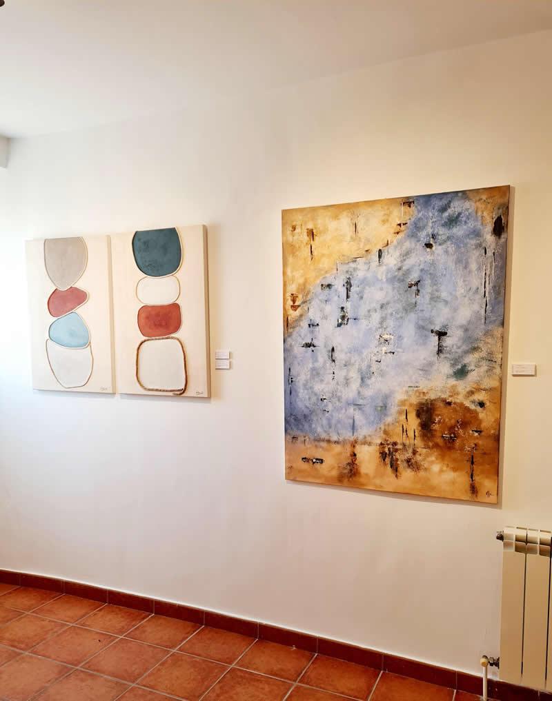 En esta colectiva, Olga no aporta obras decorativas, sino umbrales. Piezas vinculadas a sus colecciones Momentos y Susurros y Donde Habita el Alma conviven con el resto de propuestas, ofreciendo una capa de introspección que contrasta con la energía gestual de otros participantes. Color, textura y palabra funcionan como un solo lenguaje.