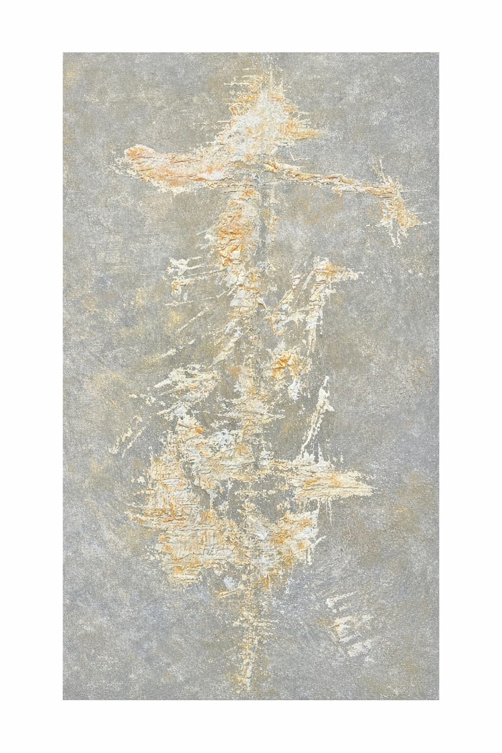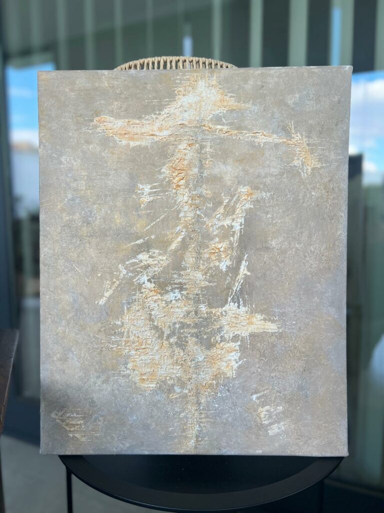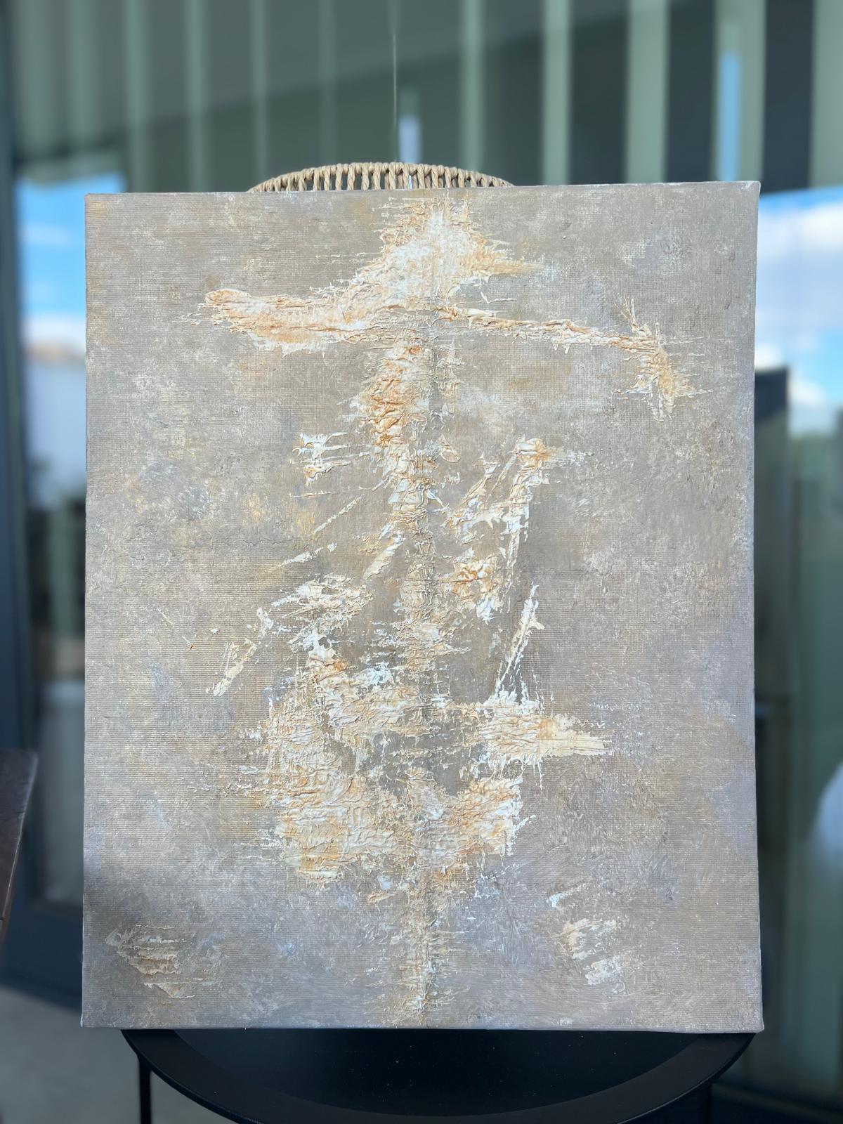 Composición vertical y alargada que evoca la figura estilizada y casi espectral de Don Quijote. Sobre una superficie rica en texturas, el acrílico se despliega en capas que sugieren desgaste y paso del tiempo. Tonos sobrios y veladuras claras crean una atmósfera de antigüedad y de mundo interior.