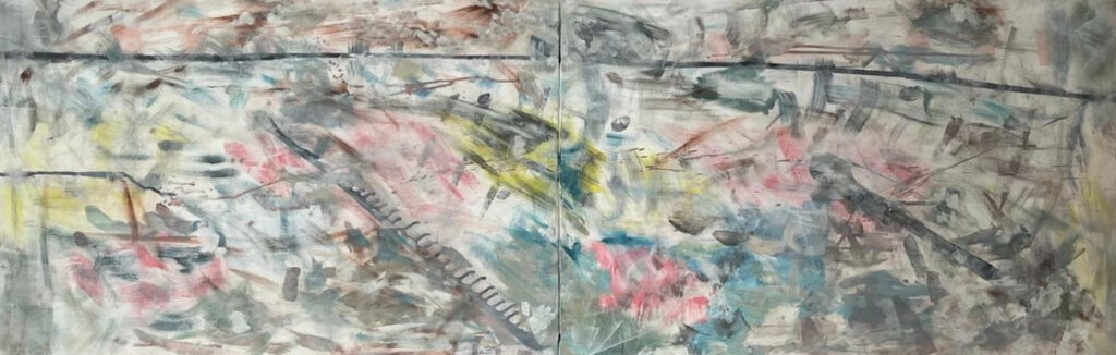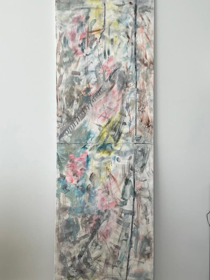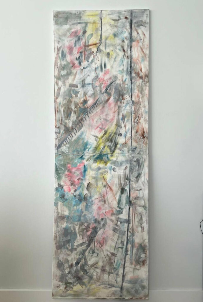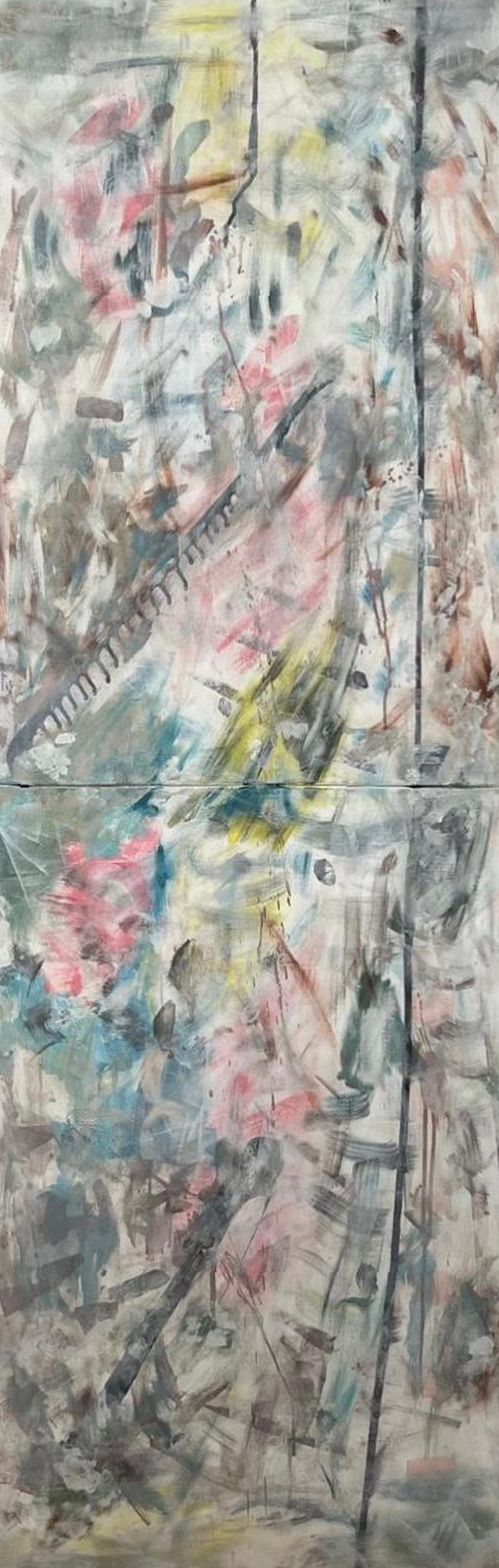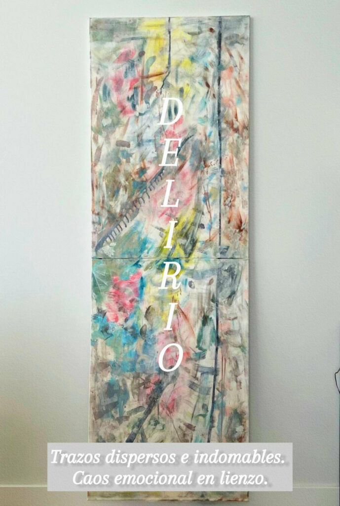 Obra que dio inicio a mi lenguaje artístico. Una energía vibrante en tonos rosas, negros y amarillos asciende como una llama vital. Es un grito de inicio, de fuerza interior que emerge. Representa mi propio renacer creativo.